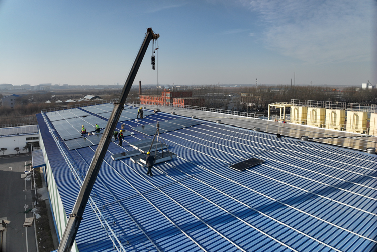 鑫达厂区屋顶上,光伏板陆续就位,施工团队有序作业,一片繁忙景象。